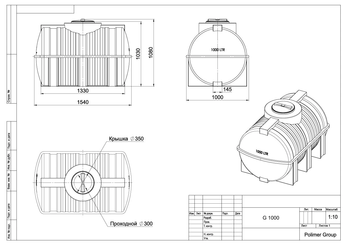 Емкость для воды горизонтальная цилиндрическая Polimer Group G 1000, наземная, габариты 1064х1040х1540, Россия, гарантия 1 год