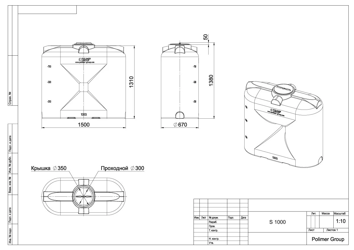 Накопительный бак для воды Polimer Group S 1000 прямоугольная, наземная, габариты 1300x670x1500, Россия, гарантия 1 год
