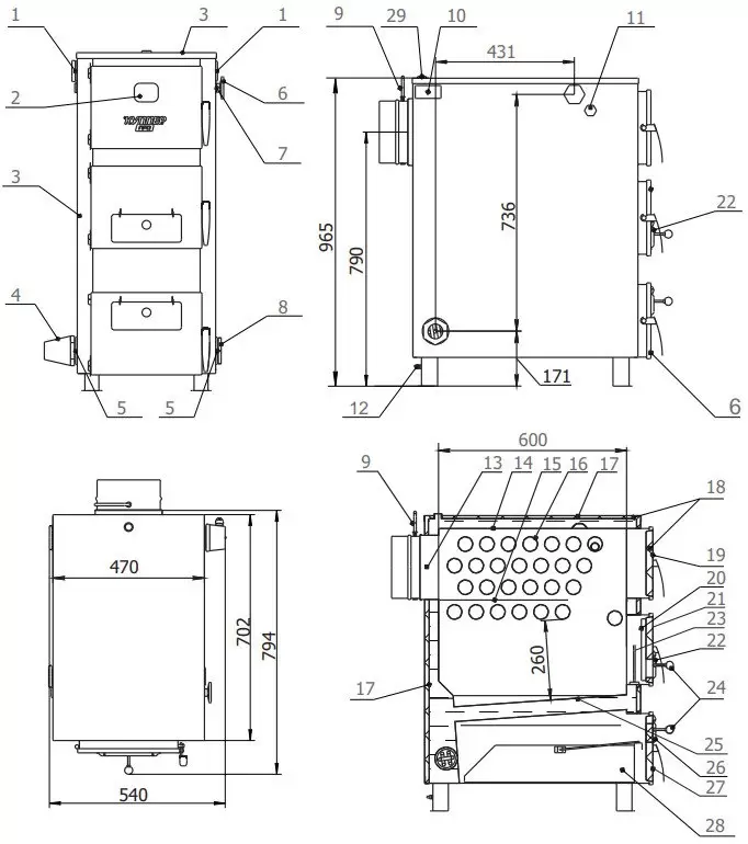 Общая информация Тип отопительного котла пеллетный Количество контуров одноконтурный Вид топлива пеллеты, брикеты, дрова, уголь Модель Куппер ПРО-42 с горелкой АПГ-42 Тип установки напольный Гарантия, лет 3 Технические характеристики Мощность, кВт 42 Отапливаемая площадь, м2 420 Глубина топки, мм 600 Тип камеры сгорания открытая Мощность нагревательного элемента системы авторозжига котла, кВт 0.56 Объем камеры сгорания, л 63 Объем бункера, л 350 Подключение Диаметр дымохода, мм 200 Диаметр подключения контура отопления, дюйм 1.1/2 Электропитание Потребляемая электроэнергия, Вт 40 Размеры и масса Вес, кг 179 Габариты (ВxШxГ), мм 965х560х820, горелка 236х316х470, бункер 839х600х535, рукав d75 Комплектация и встроенное оборудование Варочная панель нет Встроенный ТЭН, кВт есть,3x3 (220/380) Информация о производителе Торговая марка Теплодар Страна Россия -
