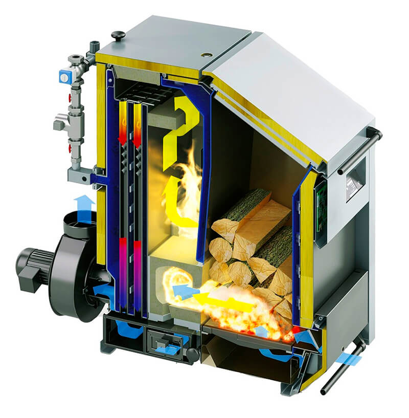 По устройству котлы данной группы отличаются от твердотопливных аналогов традиционного исполнения наличием двух камер сгорания. Первая используется для загрузки топлива, в которой оно тлеет. Во второй сжигаются горючие газы (отсек дожига). В нее для повышения эффективности процесса подается кислород. Получаемая тепловая энергия нагревает водяную рубашку, и жидкость установленной пользователем температуры поступает в контур отопления. Это общее описание конструкции пиролизных котлов. В продаже встречаются установки различных модификаций, отличающихся расположением камер относительно друг друга и способом подачи воздуха.
