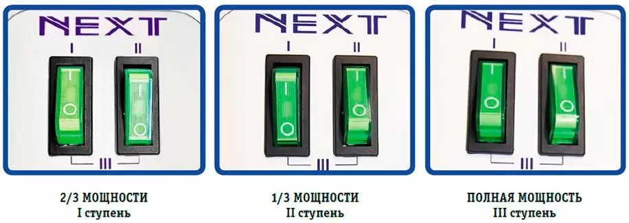 - Выключатель 1 – первая ступень мощности. Обеспечивает 2/3 от заявленных значений. Нажата первая клавиша, отключена вторая. Режим предусматривает обогрев строения в прохладные времена года – осенью, весной, дождливым летом.