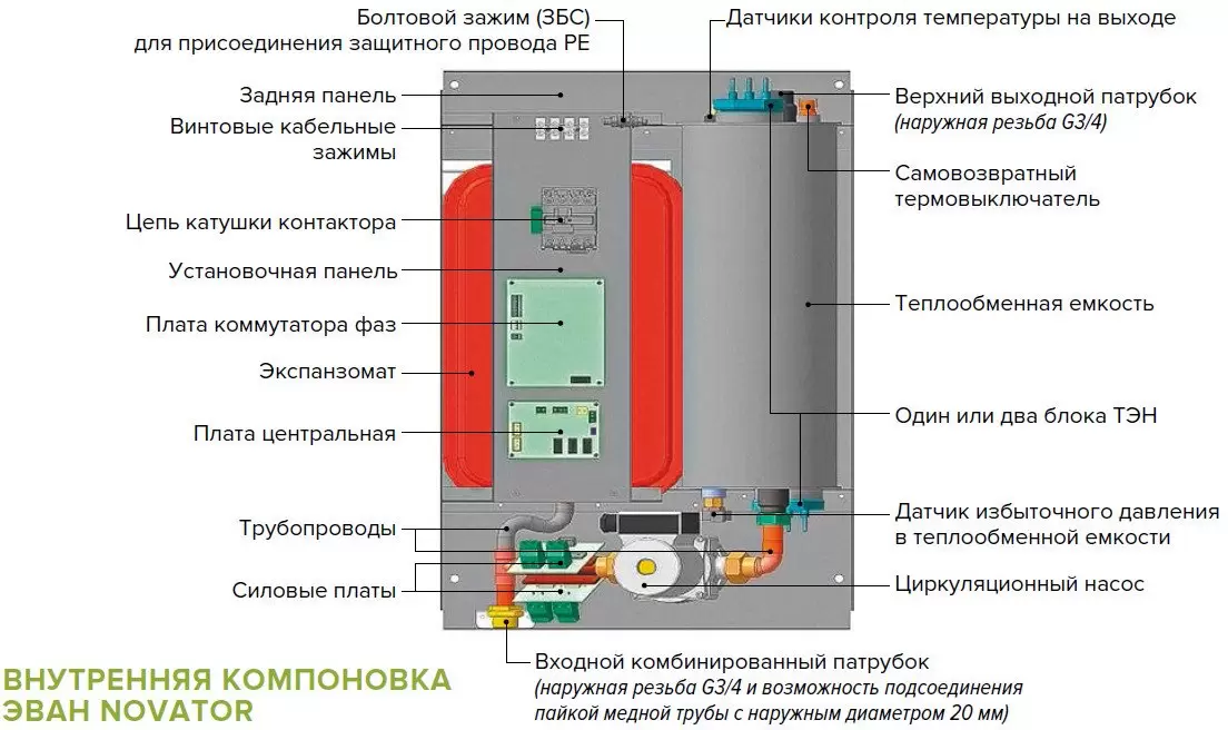 В век развитых технологий в индустрии отопительных приборов постоянно внедряются технические решения, направленные на повышение эффективности работы, безопасности и комфорта эксплуатации оборудования. Одним из результатов подобных решений является электрокотел со встроенными компонентами: циркуляционным насосом, экспанзоматом, приборами безопасности и интеллектуальной системой управления. Это существенно упрощает монтаж и обвязку котла. По сути, в рамках одного высокотехнологичного изделия собрана целая мини-котельная. Именно таким самодостаточным прибором и является ЭВАН Novator. В приборе содержится не меньше компонентов, чем нужно, каждый элемент имеет четкое предназначение, и отсутствуют избыточные элементы.