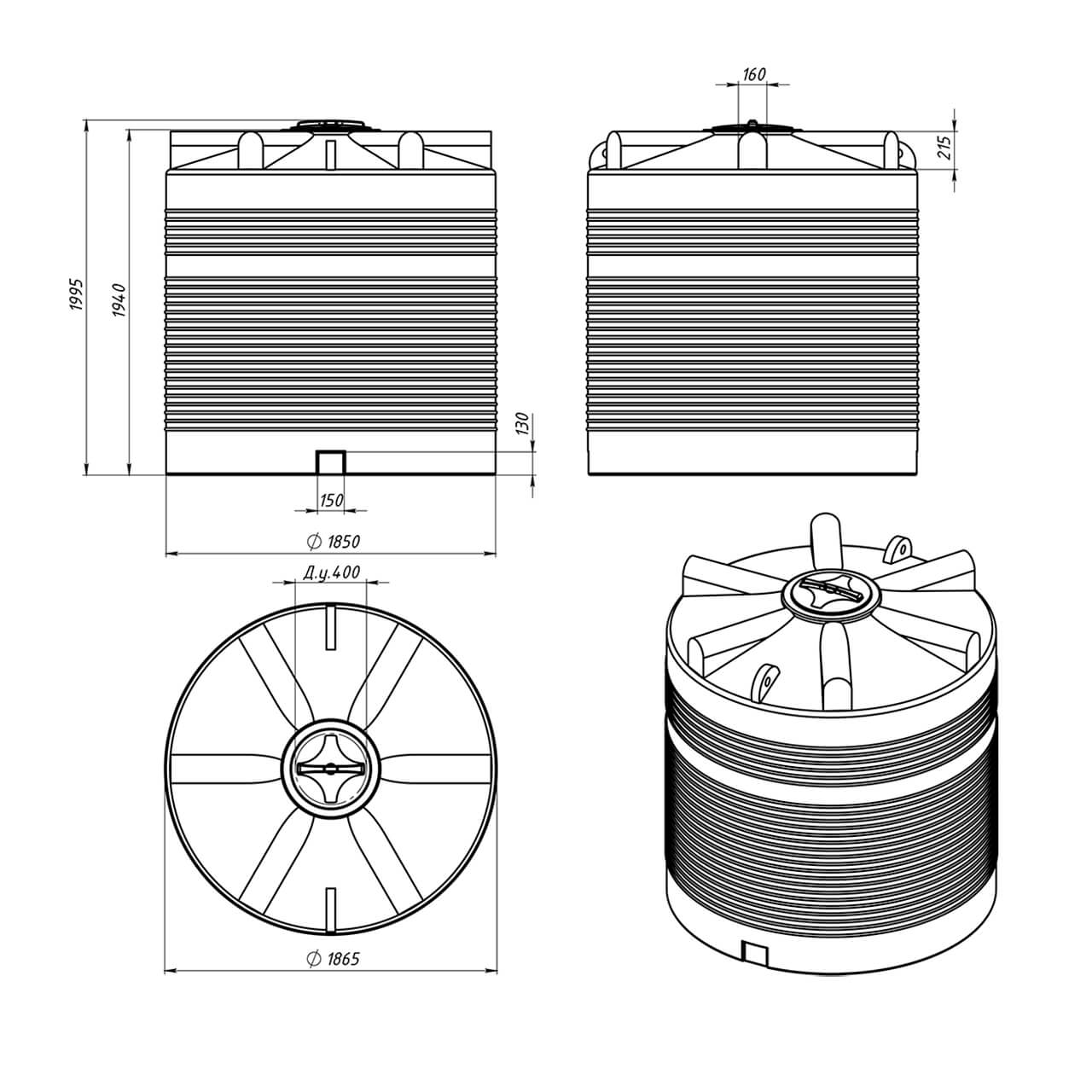Пластиковая емкость для хранения воды Экопром ЭВЛ 5000, габариты 2020x1950, форма цилиндрическая, цвет синий, расположение вертикальное, Россия, гарантия 1 год
