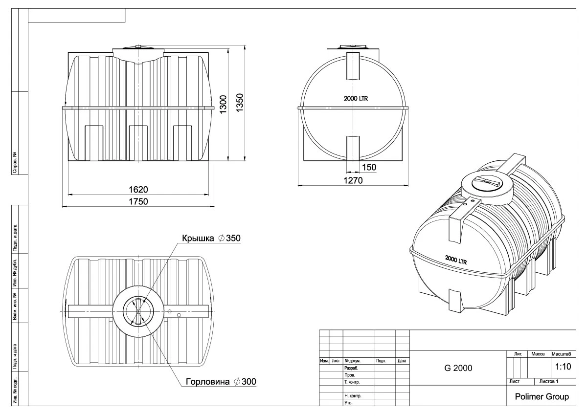 Емкость для воды горизонтальная цилиндрическая Polimer Group G 2000, наземная, габариты 1354х1270х1750, Россия, гарантия 1 год