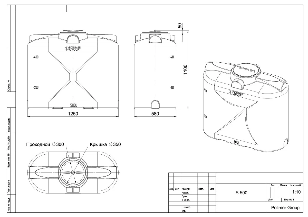 Накопительный бак для воды Polimer Group S 500 прямоугольная, наземная, габариты 1050x580x1250, Россия, гарантия 1 год