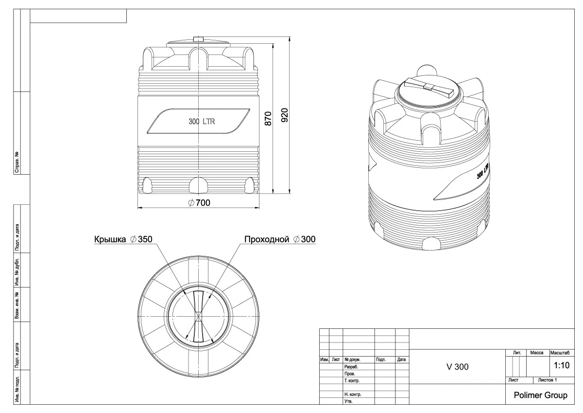 Пластиковая емкость для воды Polimer Group V 300 цилиндрическая, наземная, габариты 906x690x690, Россия, гарантия 1 год