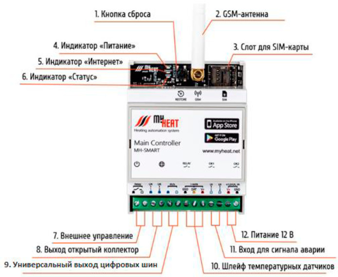 Контроллер MyHеаt Smart – устройство для подключения к отопительному оборудованию и элементам системы отопления: насосам, смесителям, бойлерам косвенного нагрева.