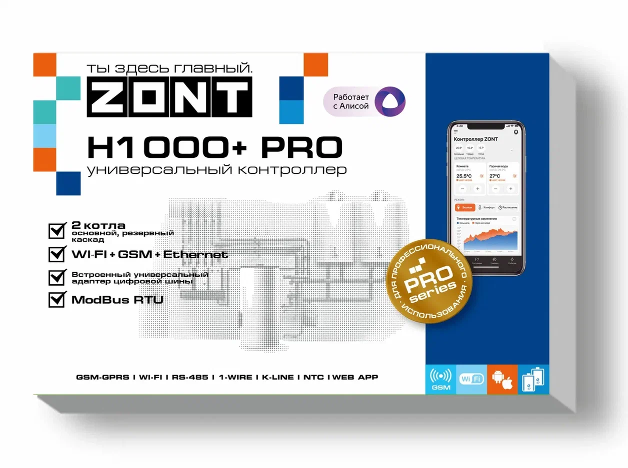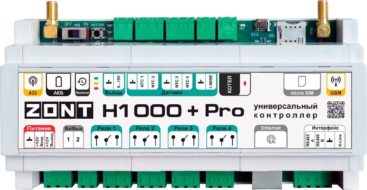 Контроллер ZONT H1000+ PRO - универсальный прибор для профессиональной автоматизации сложных инженерных систем, включая системы отопления и приготовления горячей воды. Он может дистанционно управлять работой исполнительных устройств и элементов домостроения по расписанию, сценариям или срабатыванию датчиков.