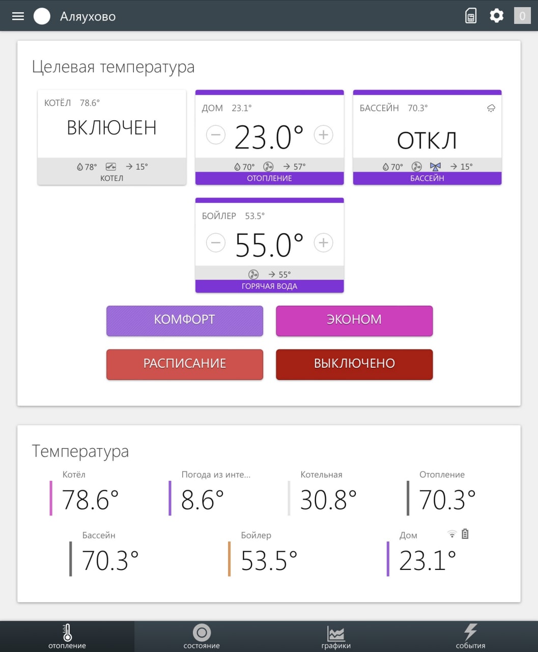 Контроллер может работать автоматически по запрограммированному алгоритму или вручную через личный кабинет веб-сервиса или мобильное приложение. Кроме того, он может учитывать температуру наружного воздуха и недельное расписание.