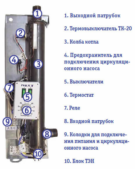 - Колодки для подключения питания и циркуляционного насоса.