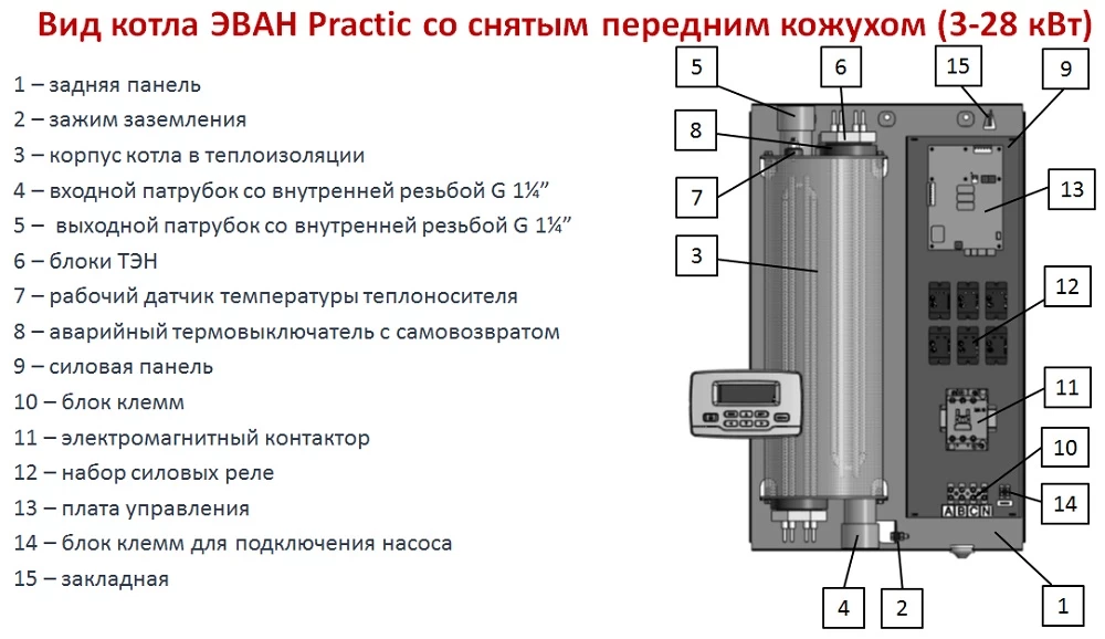 Электрический котел отопления ЭВАН Practic Pump 7, 3-ступенчатый, укомплектован циркуляционным насосом, погодозависимой автоматикой, недельным программатором, функцией управления ГВС, бесшумность работы, гарантия 2 года