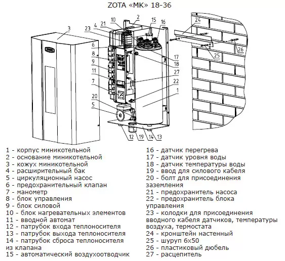 Электрокотел Zota МК 21 укомплектован циркуляционным насосом, расширительным баком, группой безопасности, подогозависимым управлением, датчиком воздуха, хронотермостатом