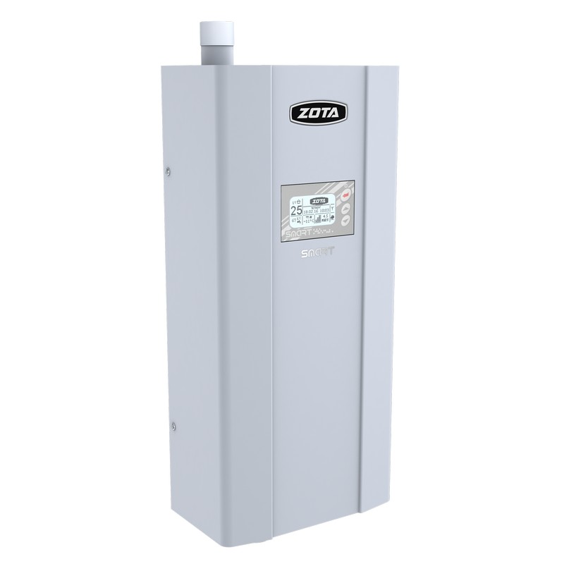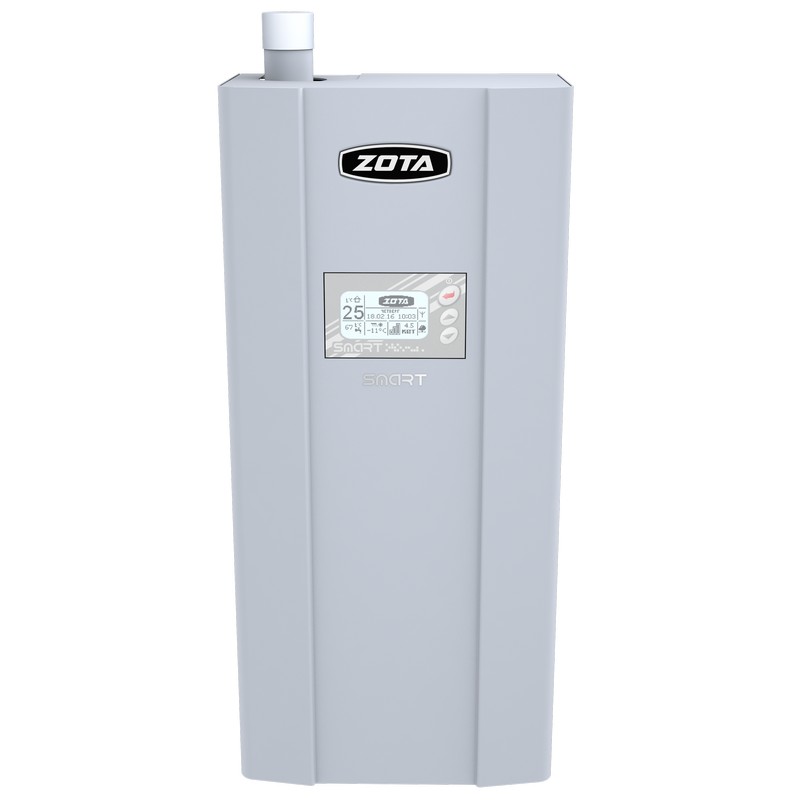 Электрический котел Zota Smart 4,5 укомплектован GSM-модулем, подогозависимым управлением, датчиком воздуха, хронотермостатом