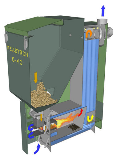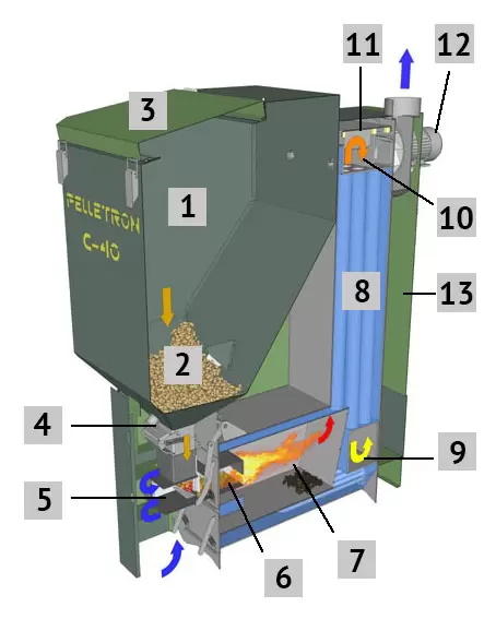 - Питатель горелки с гравитационной подачей топлива. Питатель имеет шибер нормально-закрытого типа с магнитной защелкой и термопредохранители, закрывающие подачу топлива при перегреве питателя..
