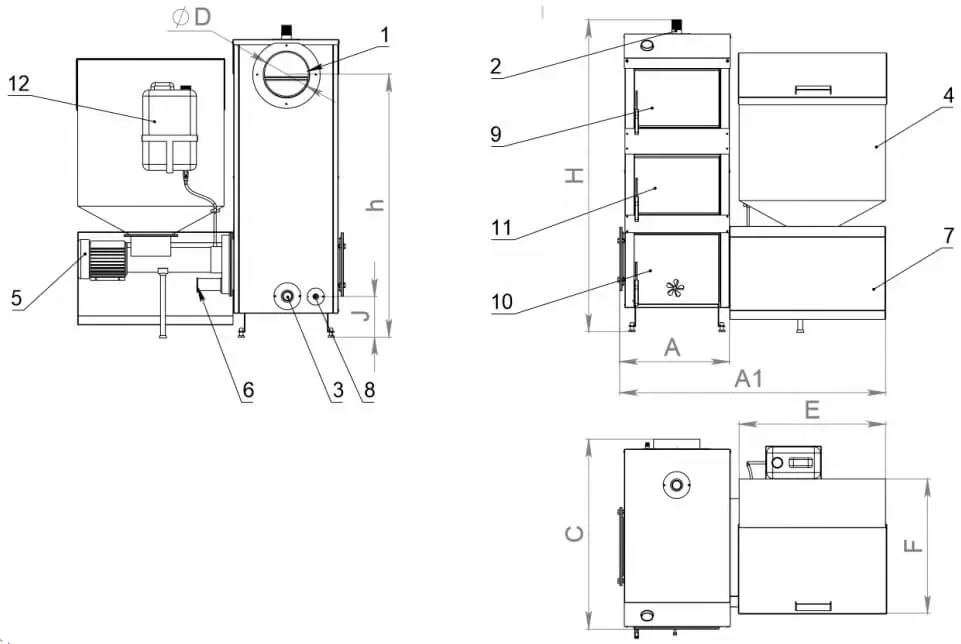 Общая информация Тип отопительного котла пеллетный Количество контуров одноконтурный Вид топлива пеллеты, уголь Модель Auto 50 Тип установки напольный Гарантия, лет 1 Подключение Диаметр дымохода, мм 200 Диаметр подключения контура отопления, дюйм 2 Электропитание Макс. потребляемая мощность, кВт 0.4 Технические характеристики Мощность, кВт 50 Отапливаемая площадь, м2 500 Тип камеры сгорания открытая Объем бункера, л 600 Объем зольника, л 34 Рабочий объем воды в котле, л 139 КПД, % 80 - 90 Размеры и масса Вес, кг 560 Информация о производителе Торговая марка Гейзер Страна Россия -