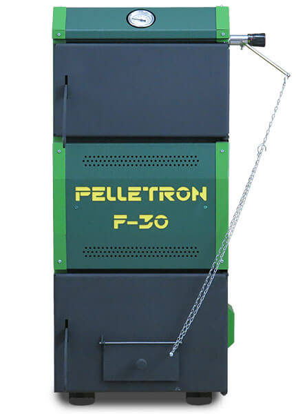 Твердотопливный пиролизный котел напольный Pelletron Ferrum 30 II, объем топочной камеры 110 л, глубина топки 515 мм, КПД 92,5%, габариты 963x476x889 мм, масса 133 кг, Россия, гарантия 2 года