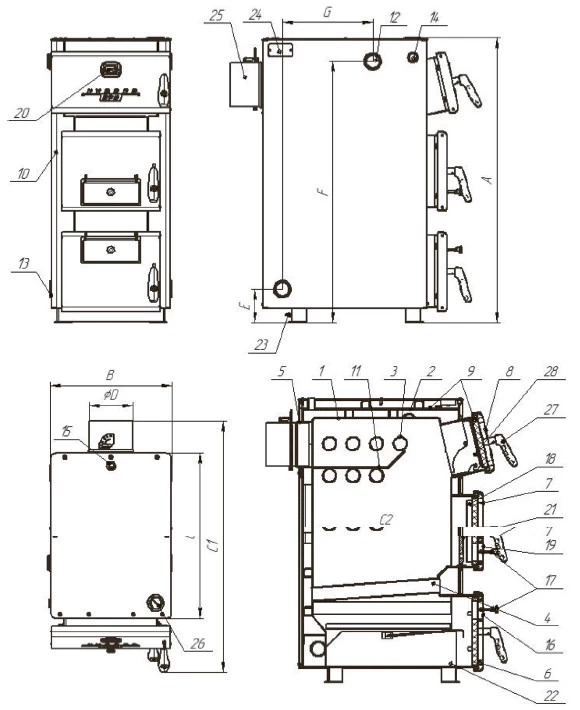 Котел твердотопливный Теплодар Куппер ПРО-22 (2.0), емкость топки 51 л, габариты 967х415х745, Россия, гарантия 48 месяцев
