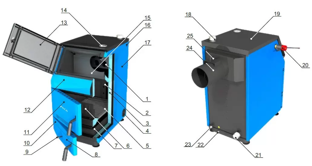 - предусмотрены 2 варианта загрузки топлива. Благодаря горизонтальной дверце, открывающей доступ к теплообменнику, осуществляется верхняя загрузка угля. Использование шуровочной дверцы позволяет загружать дрова;