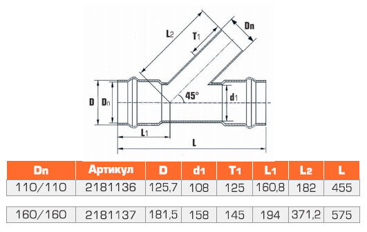 Тройник напорный двухраструбный НПВХ 160x160/45*