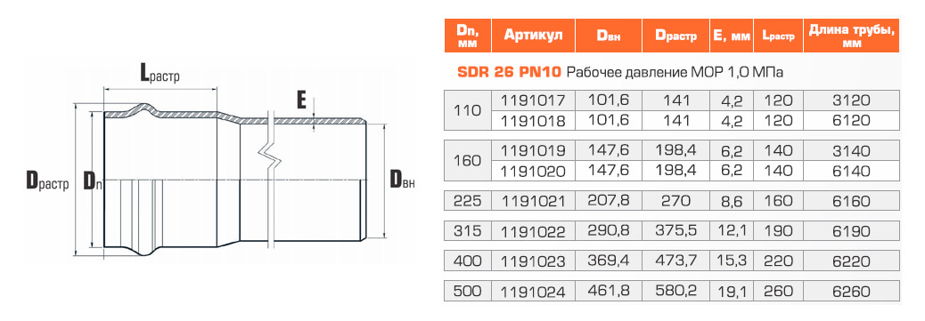 Общая информация Срок службы, лет более 50 Тип соединения раструбный с резиновым уплотнительным кольцом Стандарт ГОСТ Р 32415-2013 Технические характеристики Макс. рабочее давление, бар 10 Макс. рабочая температура, °С 45 Дополнительная информация Материал непластифицированный поливинилхлорид (НПВХ) Применение напорное водоснабжение, ливневая канализация, напорная канализация Структура изделия однослойная со сплошной стенкой Размеры и масса Вес, кг 14.19 SDR 26 Диаметр внутренний, мм 147.6 Диаметр раструба, мм 198.4 Диаметр, мм 160 Длина раструба, мм 140 Объем, м3 0.0999 Толщина стенки, мм 6.2 Длина трубы, м 3140 Информация о производителе Торговая марка Хемкор Страна Россия -