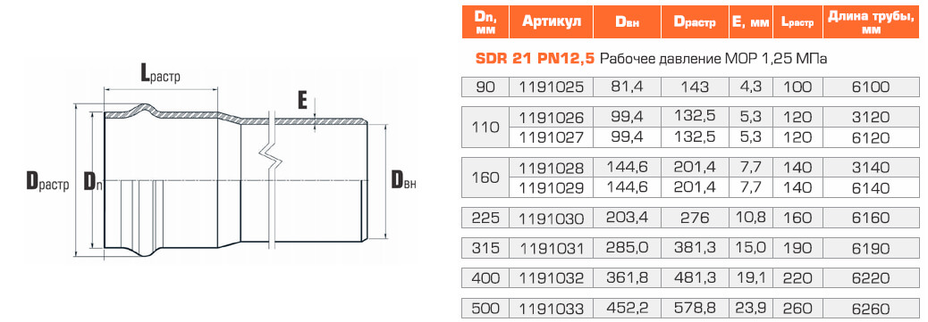 Общая информация Срок службы, лет более 50 Тип соединения раструбный с резиновым уплотнительным кольцом Стандарт ГОСТ Р 32415-2013 Технические характеристики Макс. рабочее давление, бар 12.5 Макс. рабочая температура, °С 45 Дополнительная информация Материал непластифицированный поливинилхлорид (НПВХ) Применение напорное водоснабжение, ливневая канализация, напорная канализация Структура изделия однослойная со сплошной стенкой Размеры и масса Вес, кг 130.55 SDR 21 Диаметр внутренний, мм 285 Диаметр раструба, мм 381.3 Диаметр, мм 315 Длина раструба, мм 190 Объем, м3 0.7981 Толщина стенки, мм 15 Длина трубы, м 6190 Информация о производителе Торговая марка Хемкор Страна Россия -