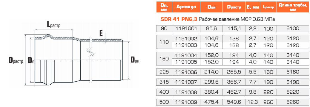 Общая информация Срок службы, лет более 50 Тип соединения раструбный с резиновым уплотнительным кольцом Стандарт ГОСТ Р 32415-2013 Технические характеристики Макс. рабочее давление, бар 6.3 Макс. рабочая температура, °С 45 Дополнительная информация Материал непластифицированный поливинилхлорид (НПВХ) Применение напорное водоснабжение, ливневая канализация, напорная канализация Структура изделия однослойная со сплошной стенкой Размеры и масса Вес, кг 68.96 SDR 41 Диаметр внутренний, мм 299.6 Диаметр раструба, мм 366.7 Диаметр, мм 315 Длина раструба, мм 190 Объем, м3 0.7981 Толщина стенки, мм 7.7 Длина трубы, м 6190 Информация о производителе Торговая марка Хемкор Страна Россия -