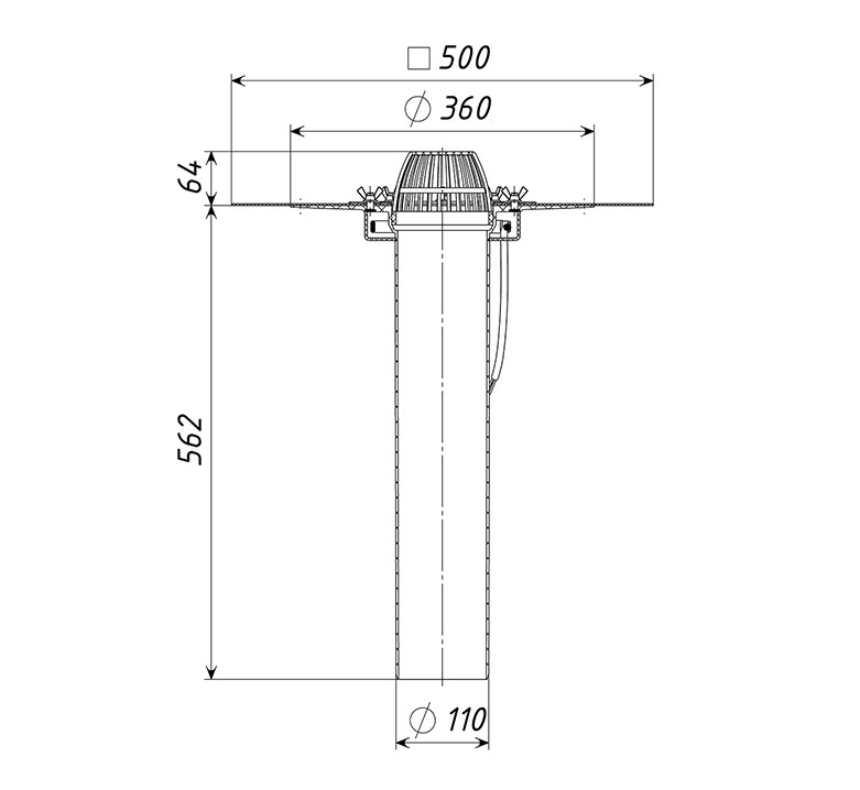 Кровельная воронка ТП-01.100/6/B-Э с вертикальным выпуском D=110 мм, H=600 мм с электрообогревом, листвоуловителем и прижимным фланцем