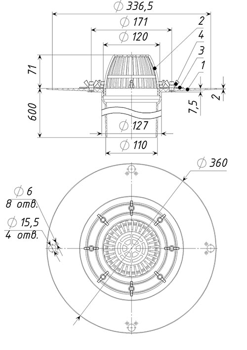 Кровельная воронка ТП-02.100/6 с вертикальным выпуском D=110 мм, H=600 мм с листвоуловителем и прижимным фланцем