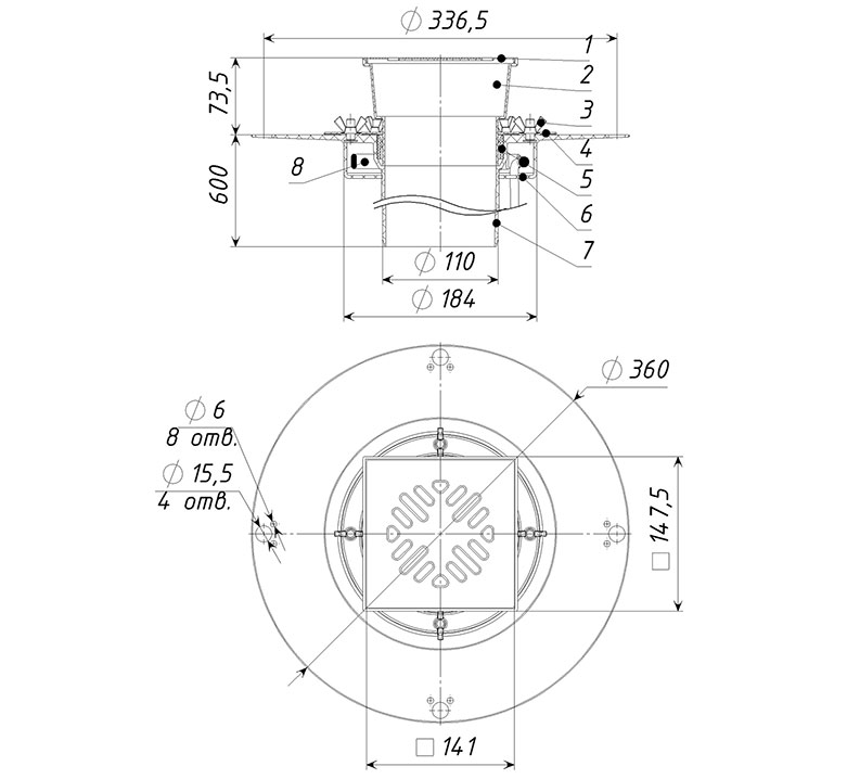 Кровельная воронка ТП-03.100/6-Э с вертикальным выпуском D=110 мм, H=600 мм с электрообогревом, листвоуловителем и прижимным фланцем