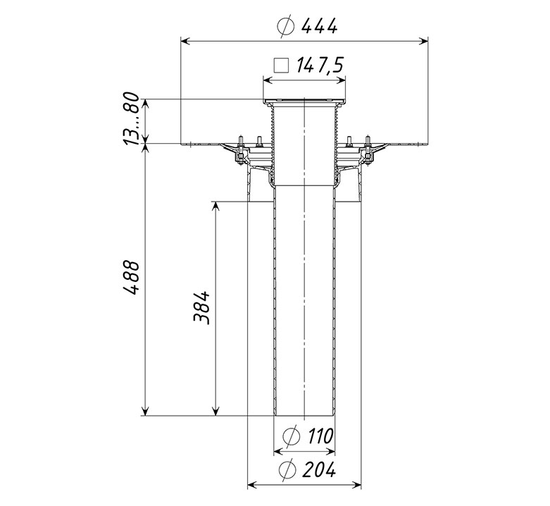 Кровельная воронка ТП-03.У.100/4 с вертикальным выпуском D=110 мм, H=102 мм с листвоуловителем и прижимным фланцем
