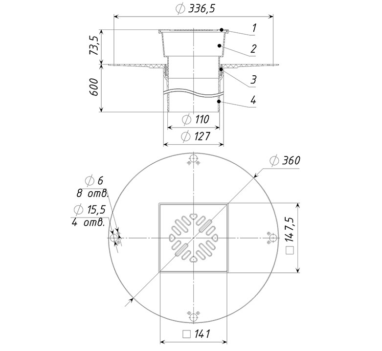 Кровельная воронка ТП-04.100/6 с вертикальным выпуском D=110 мм, H=600 мм с листвоуловителем и прижимным фланцем