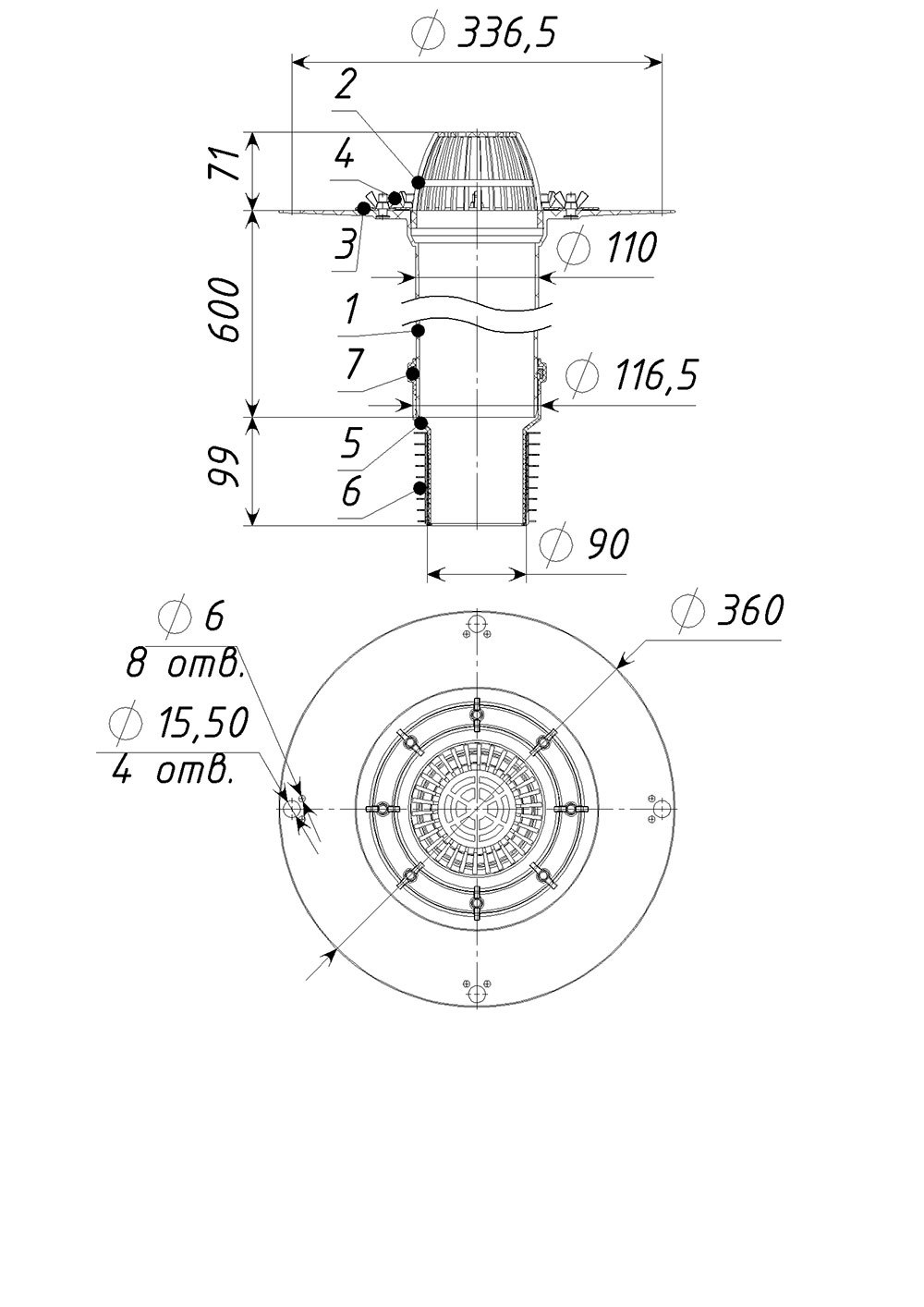 Кровельная воронка ТП-07.100/6 с вертикальным выпуском D=110 мм, H=600 мм с ремонтным переходом, листвоуловителем и прижимным фланцем