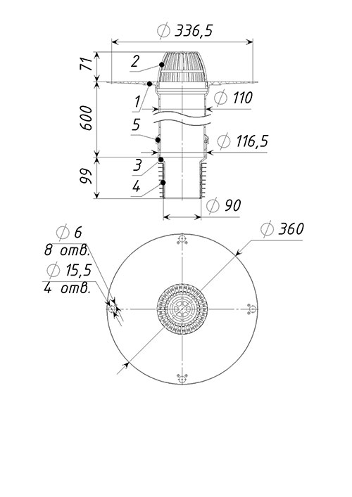 Кровельная воронка ТП-08.100/6 с вертикальным выпуском D=110 мм, H=600 мм с листвоуловителем и прижимным фланцем