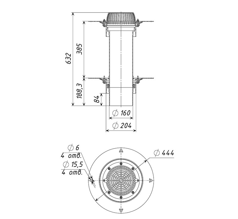 Кровельная воронка ТП-09.160 двухуровневая D=160 мм, H=385 мм с листвоуловителем и прижимными фланцами