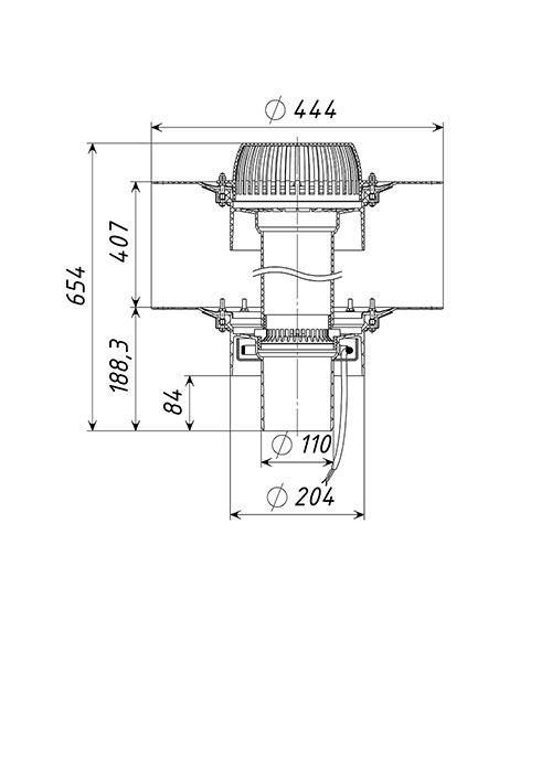 Кровельная воронка ТП-09.У.100-Э двухуровневая D=110 мм, H=600 мм с электрообогревом, с листвоуловителем и прижимными фланцами