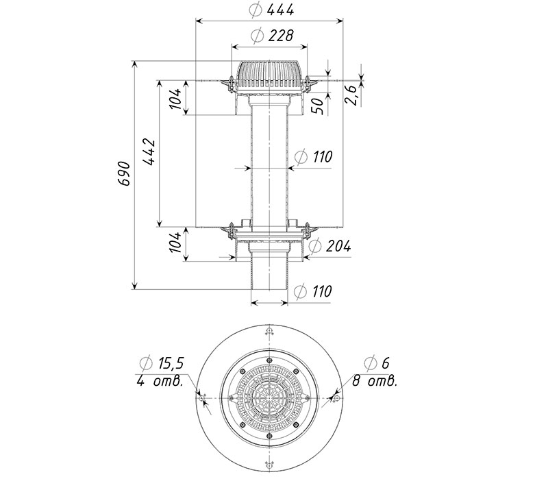 Кровельная воронка ТП-09.У.100 двухуровневая D=110 мм, H=600 мм с листвоуловителем и прижимными фланцами