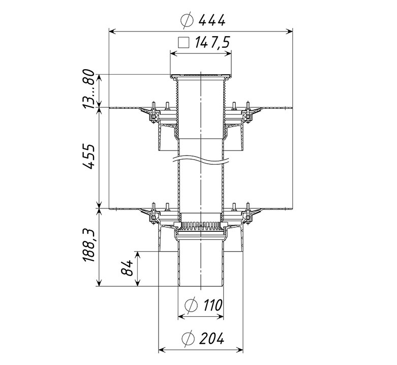 Кровельная воронка ТП-10.У.100 двухуровневая D=110 мм, H=450 мм с листвоуловителем и прижимными фланцами