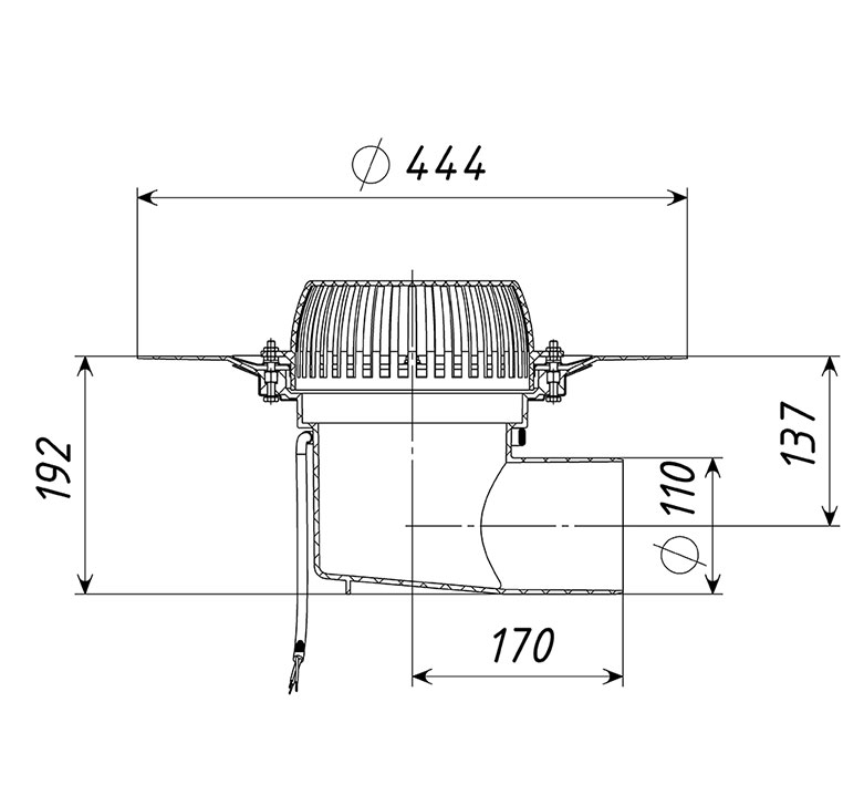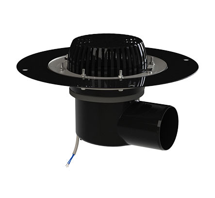 Кровельная воронка ТП-64-Э с горизонтальным выпуском D=110 мм, H=137 мм с электрообогревом, листвоуловителем и прижимным фланцем