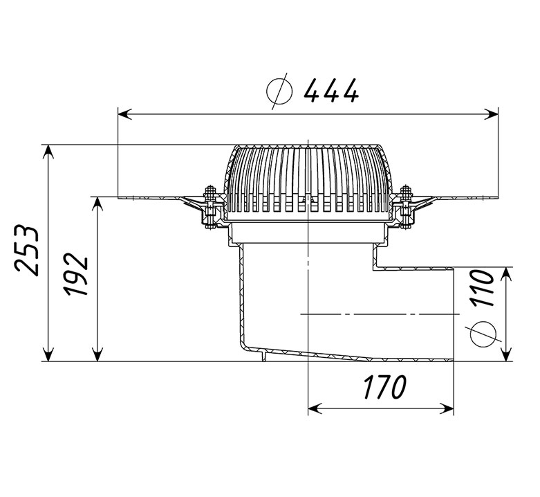 Кровельная воронка ТП-64 с горизонтальным выпуском D=110 мм, H=450 мм с листвоуловителем и прижимным фланцем