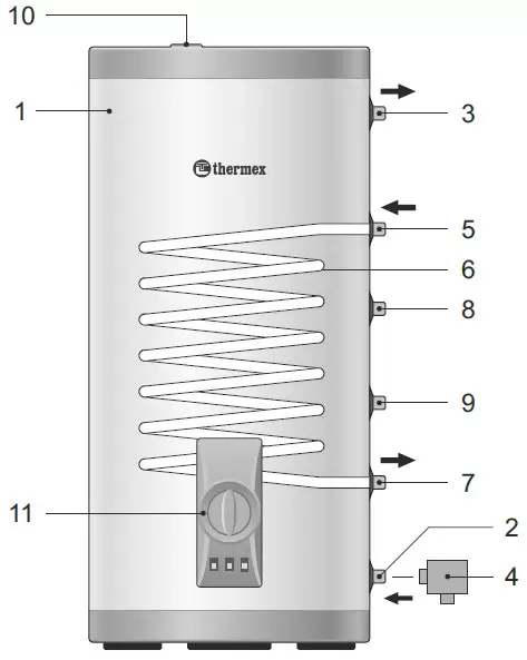 - Патрубок для монтажа погружной гильзы датчика системного соединения котла горячей воды.